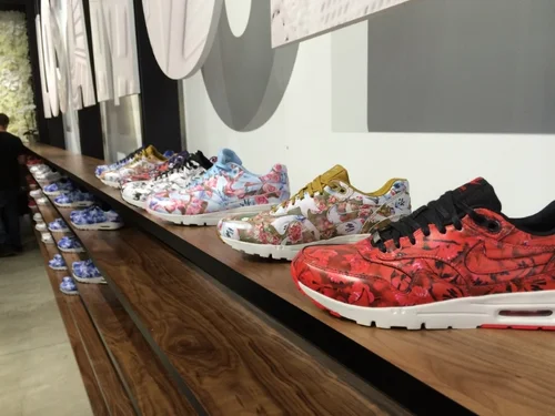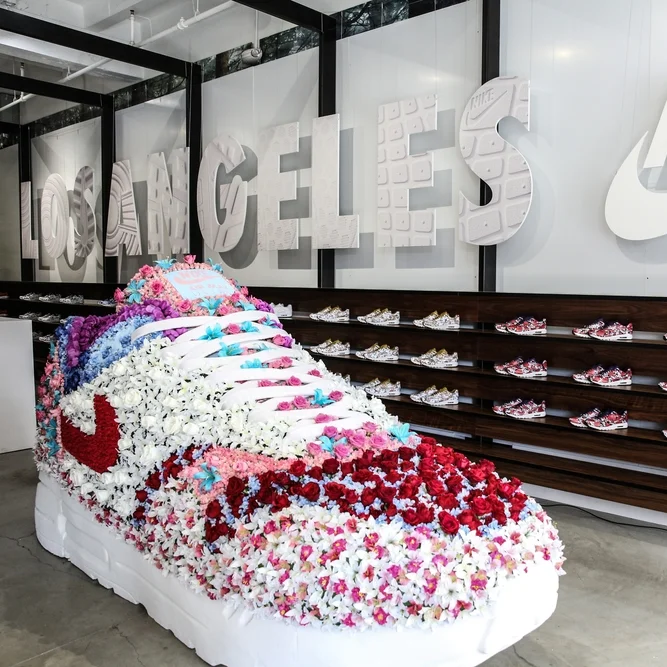 I was the lead designer for this installation at Blends, in Beverly Hills, for the launch of the Air Max 1 Women’s City Collection. The collection included six Air Max 1 shoes, each with distinct floral patterns to celebrate six cities known for their fashion sense and passionate running populations. London, Milan, New York, Paris, Shanghai and Tokyo were all represented, culminating with a large-scale footwear sculpture constructed from real flowers.